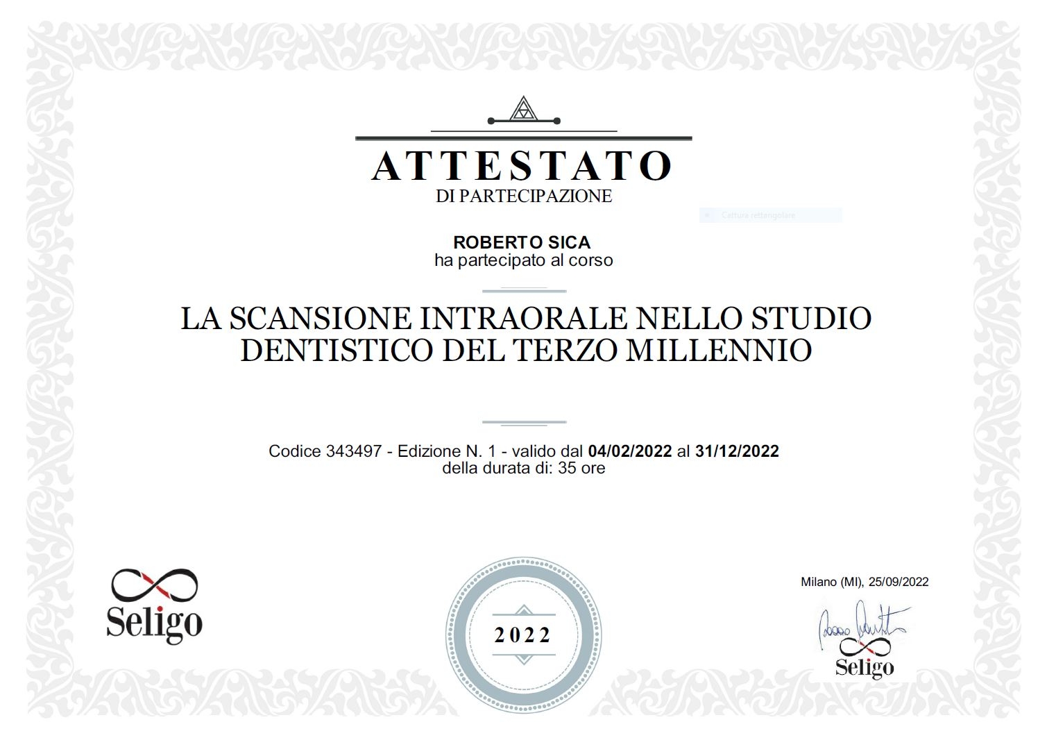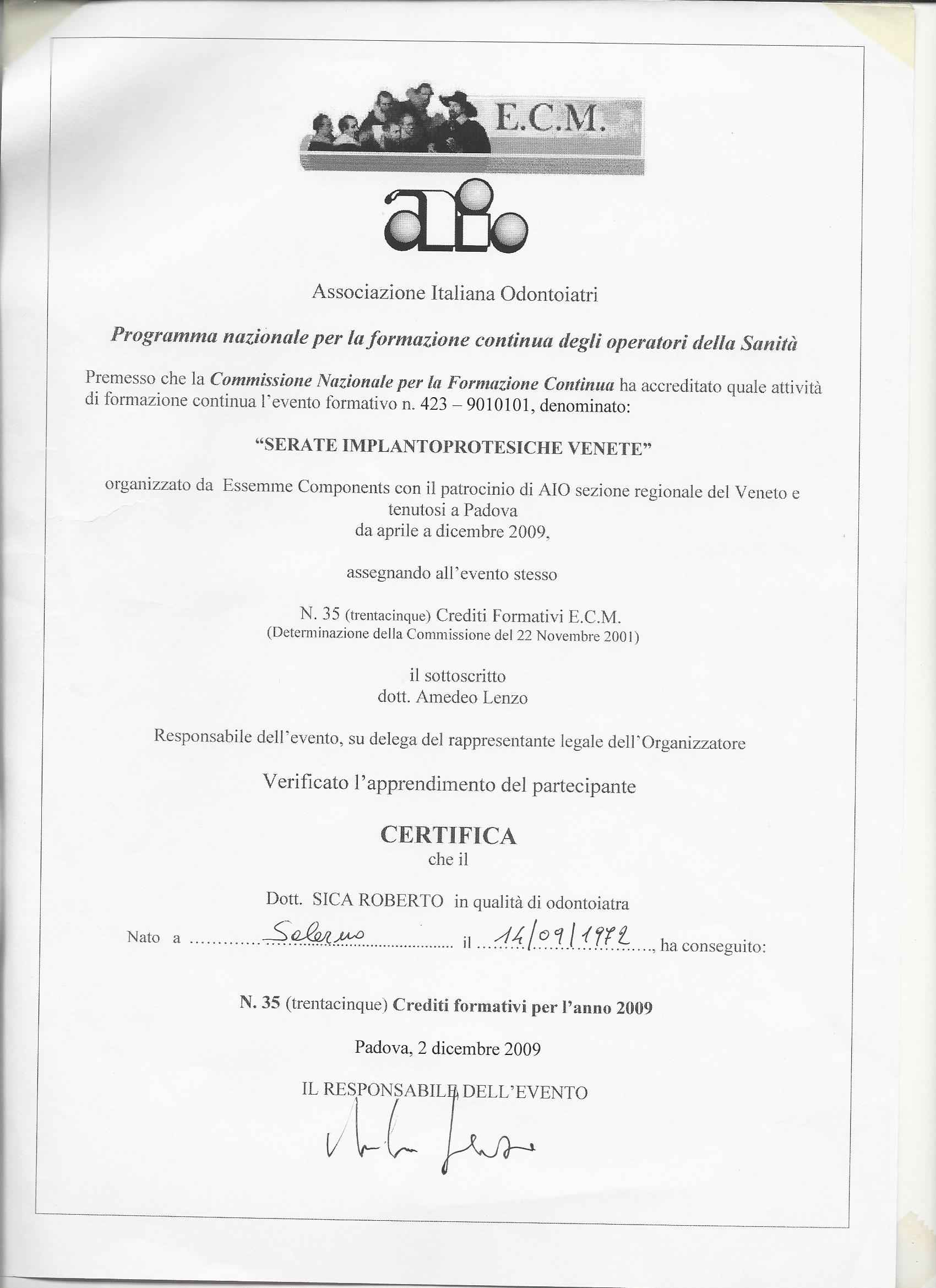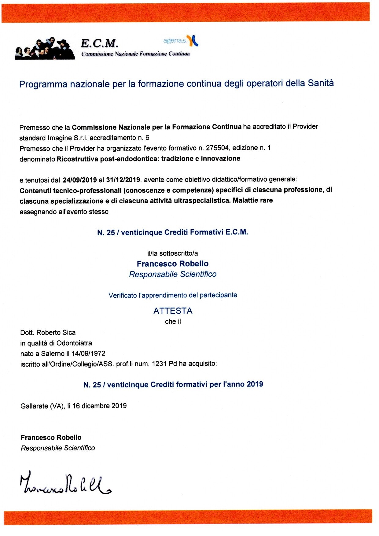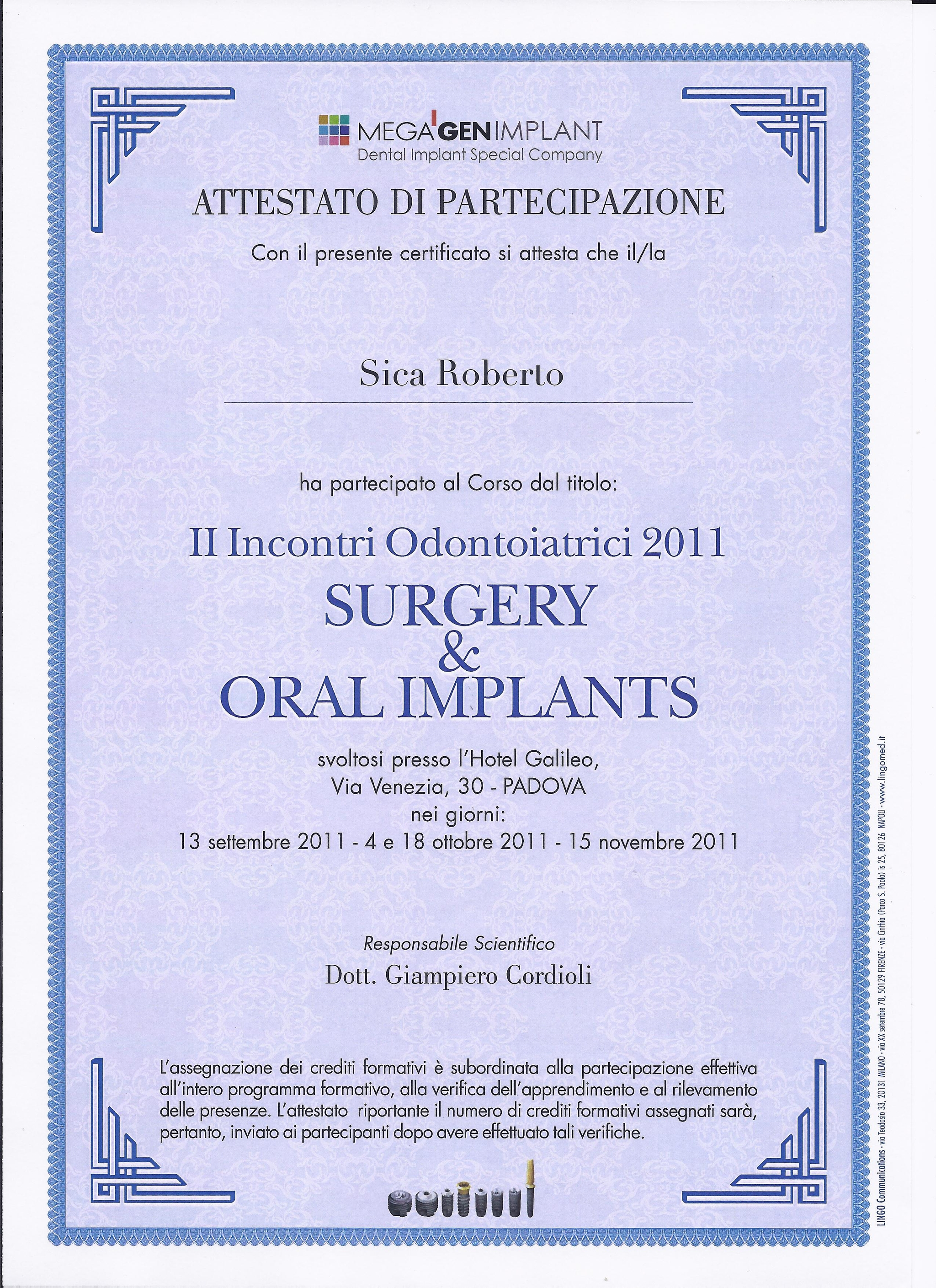 Laureato presso l’Università degli Studi di Roma “La Sapienza”nel 1997 in Medicina e Chirurgia / Odontoiatria e Protesi Dentaria con il massimo dei voti e lode, con tesi sperimentale nell'ambito della Chirurgia Orale.